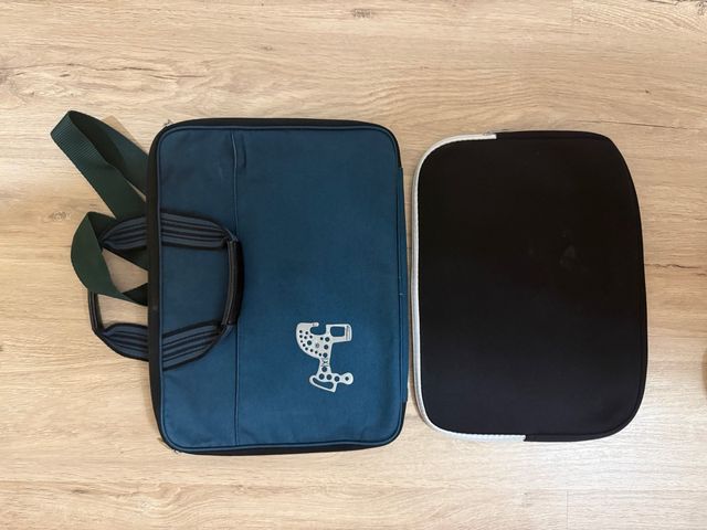Maletín y funda para ordenador portátil con diseño del Caballo Numantino. - Maletín azul con asas y correa. - Funda negra con borde blanco.