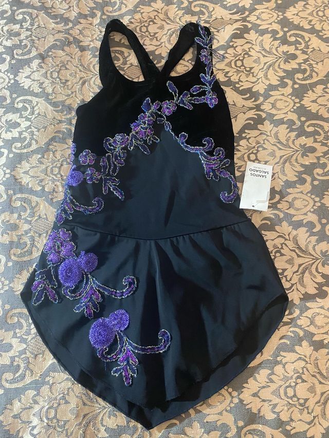 Detalles del productoMalla de patinaje artístico en color negro, con detalles bordados en morado y plateado.