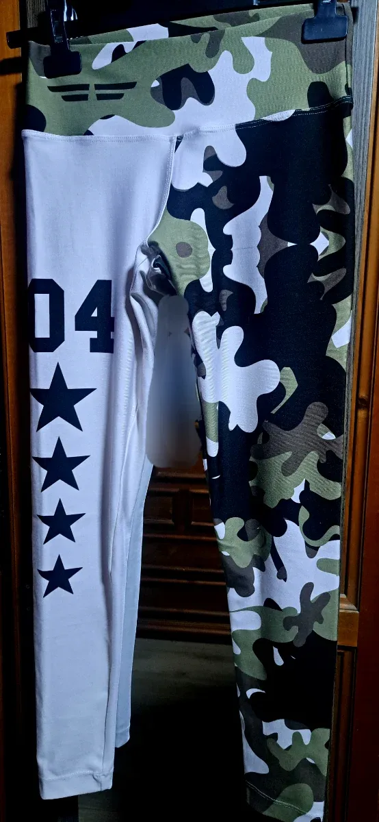 - Diseño blanco con estrellas y número 04 en la otra pierna.