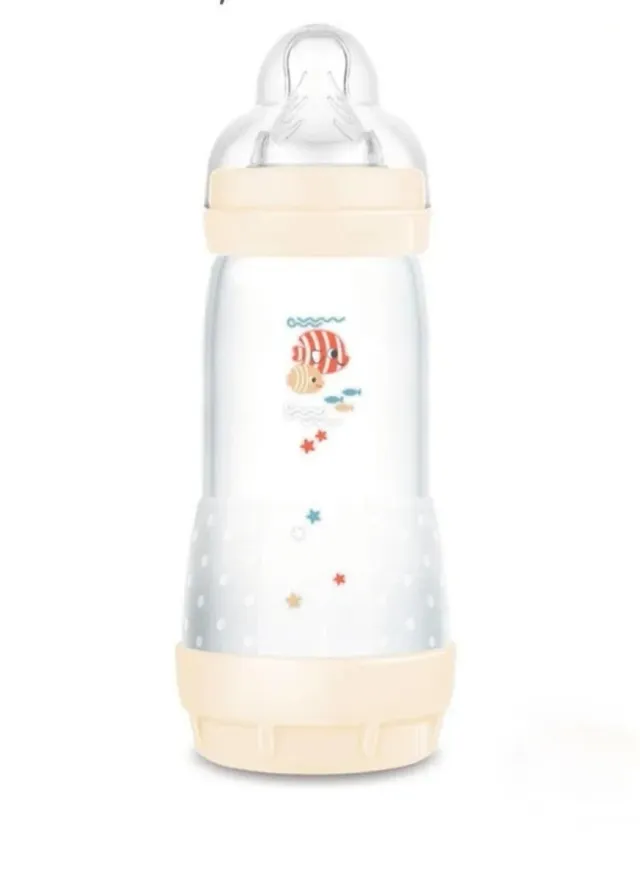 MAM Biberón Anticólicos, a partir de 4 Meses, 320ml, con Tetina 3 Flujo Rápido de Silicona de Fácil Aceptación, Autoesterilizable y Fácil de Limpiar, MAM Easy Start Anti-Colic, Materiales Sin BPA y BPS, Neutro Brillante, Diseño Peces.