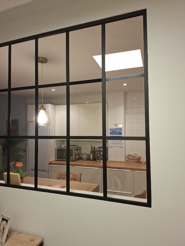 Detalles del productoPartes de Preciosa mampara de cristal con estructura negra. Ideal para separar ambientes. Piezas sueltas de modelo Leroy Merlín Vente Unique Modelo Oransa