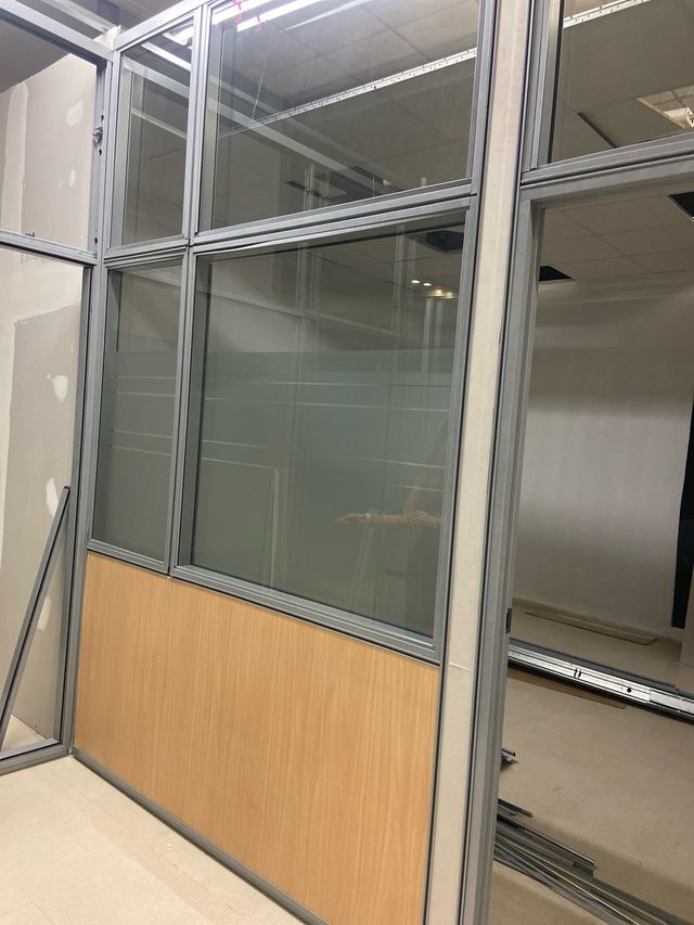 Detalles del productoMampara de oficina con doble cristal, ideal para dividir espacios de forma elegante y funcional. Mide 1,80 de ancho. Está desmontada
