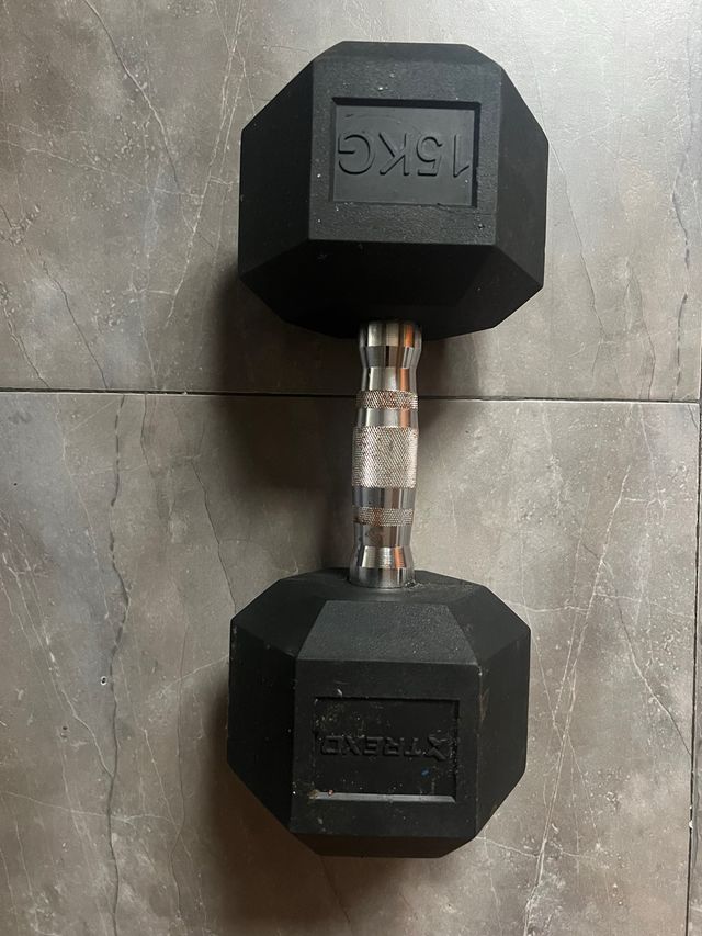 Mancuerna de 15 kg con diseño hexagonal. - Peso: 15 kg - Forma: Hexagonal - Material: metal - Marca: Xtrend