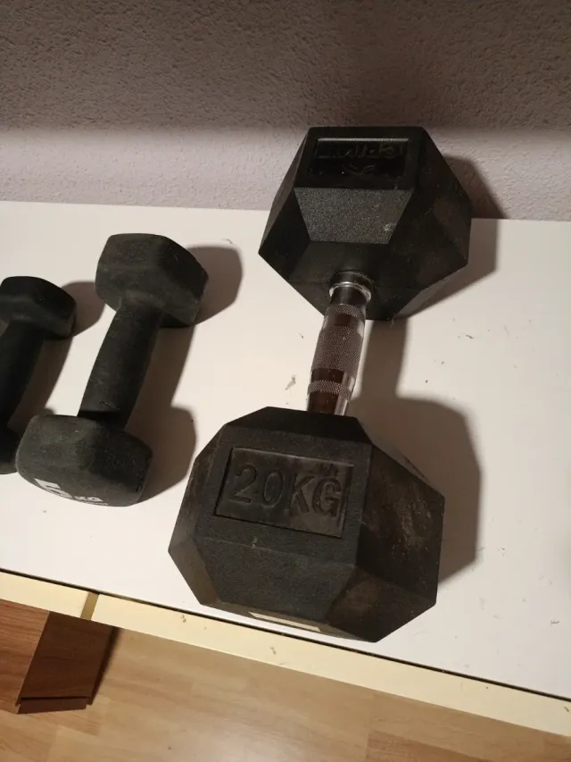 Detalles del productomancuerna hexagonal de 20 kg, 5kg, 2kg, 1kg + 3 discos de 1 kg Ideal para entrenamientos de fuerza.