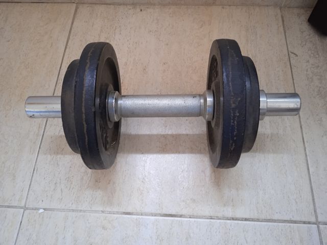 Mancuerna con dos discos de peso. - Barra con agarre texturizado. - Dos discos de peso negros.
