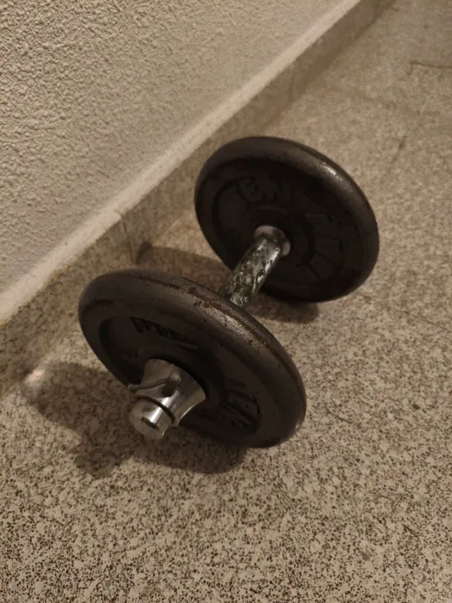 Mancuerna con discos de peso. - Incluye 2 discos de 4 kg cada uno. - Le falta un cierre a la mancuerna.