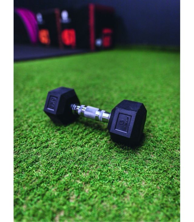 Mancuerna de 8 kg con diseño hexagonal. Ideal para entrenamientos de fuerza. - Peso: 8 kg. - Forma: Hexagonal. - Material: Goma y acero.