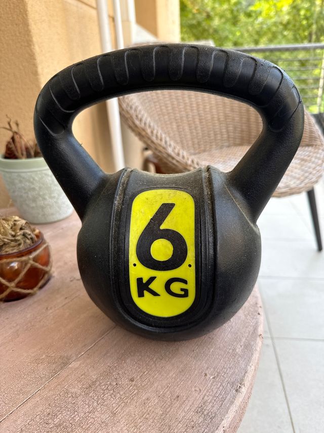 Mancuerna rusa de 6 kg, ideal para entrenamientos. - Color negro con detalles en amarillo. - Peso marcado claramente en KG.
