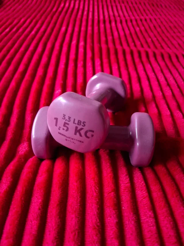Par de mancuernas de color lila, perfectas para entrenamientos en casa.