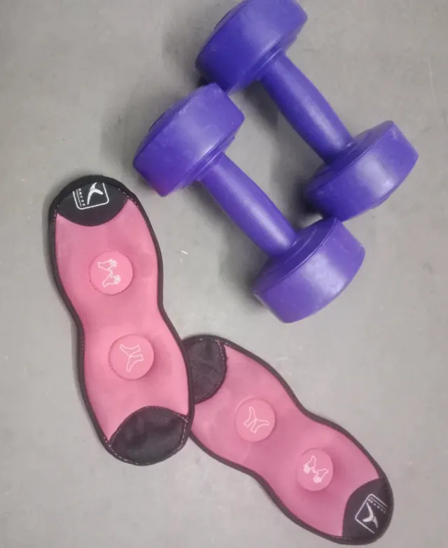 Detalles del productoPar de mancuernas de 2 kg cada una y un par de muñequeras/Tobilleras de 1 k cada una, perfectas para entrenamientos en casa.