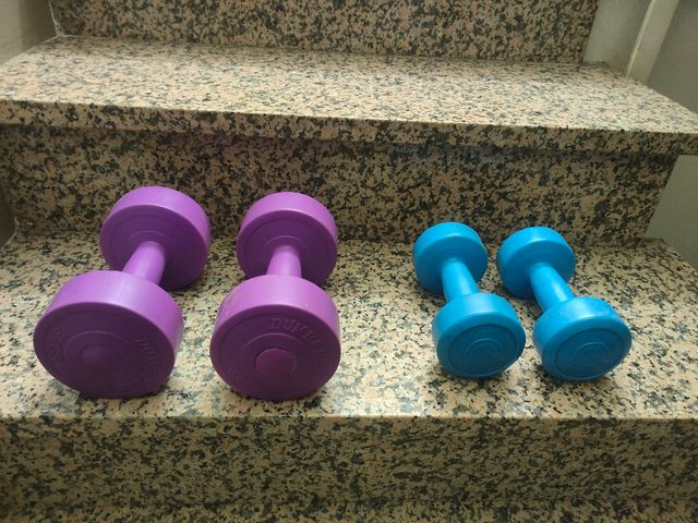 Par de mancuernas moradas de 1.5kg cada una y par de mancuernas azules de 3kg cada una. Son de plástico y se encuentran en buen estado.