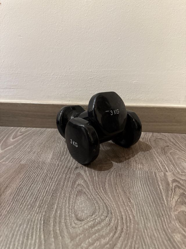 Par de mancuernas de 3kg cada una, perfectas para entrenamientos en casa. - Marca: Decathlon - Peso: 3 kg por mancuerna - Color: Negro