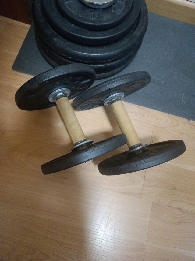 Detalles del productoMancuernas 4,5kg. Discos del decathlon y barra casera.