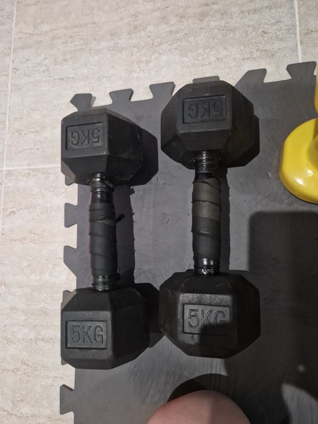 Detalles del productoPar de mancuernas de 5kg cada una. Y un par de mancuernas de 4kg cada una. Ideales para entrenamiento en casa.