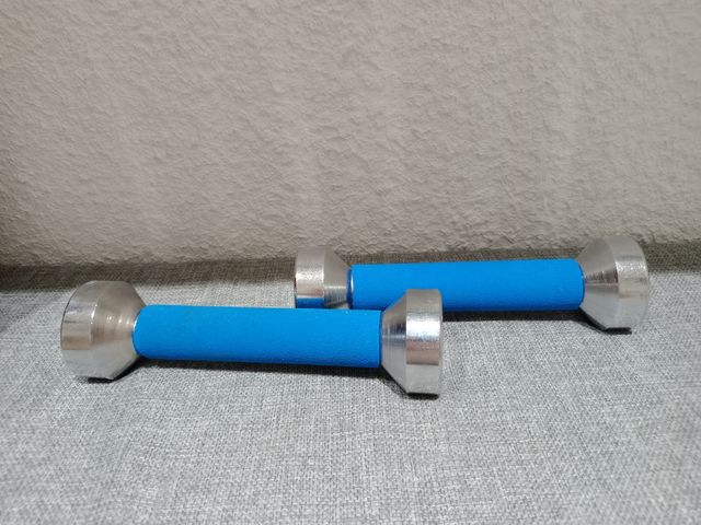en buen estado ⭐⭐⭐⭐⭐ mancuernas piel y acero, color azul 1 kilo cada una envío disponible