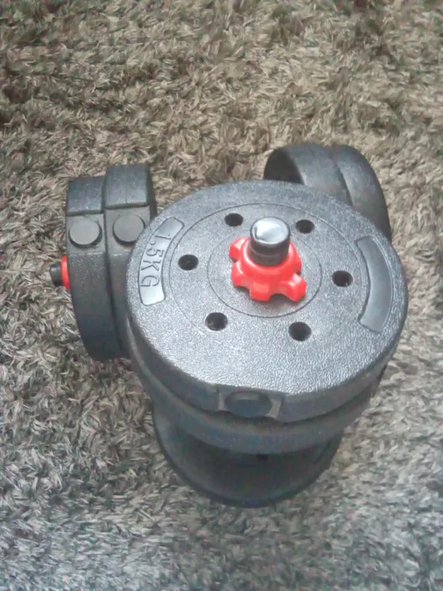 Juego de mancuernas ajustables con discos de 1.5KG. y de 2kg - Discos de peso. - Mecanismo de ajuste. - Color negro y detalles rojos.