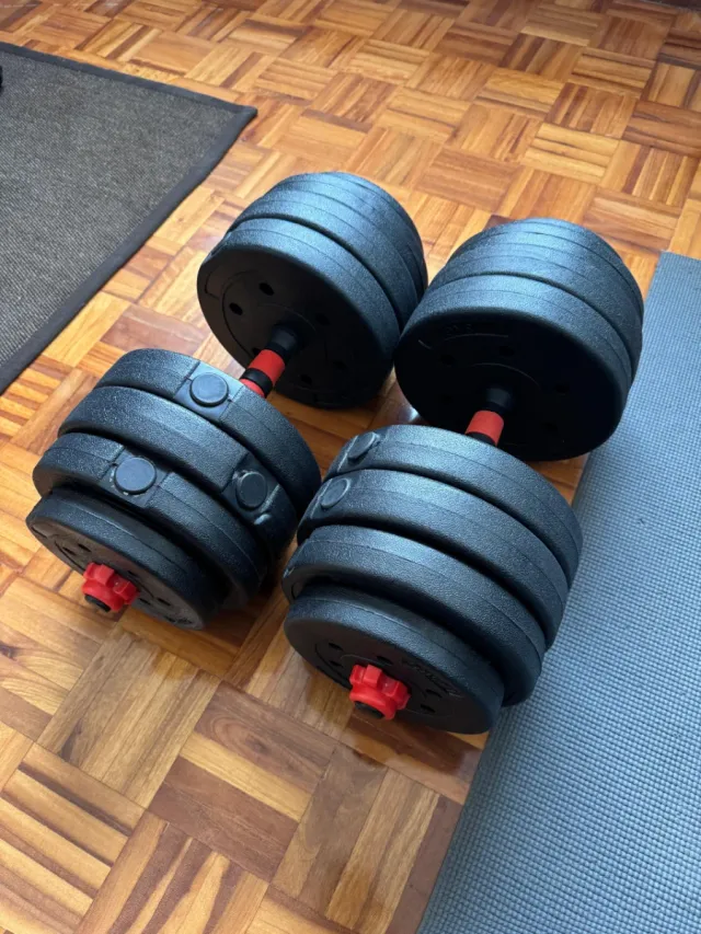 Detalles del productoPar de mancuernas ajustables, cada una con un peso máximo de 20 kg. Ideales para entrenamientos en casa.