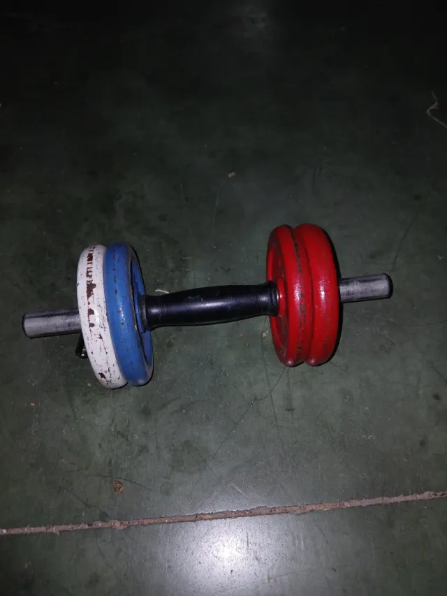 Detalles del productoJuego de mancuernas con discos de colores para entrenamiento.