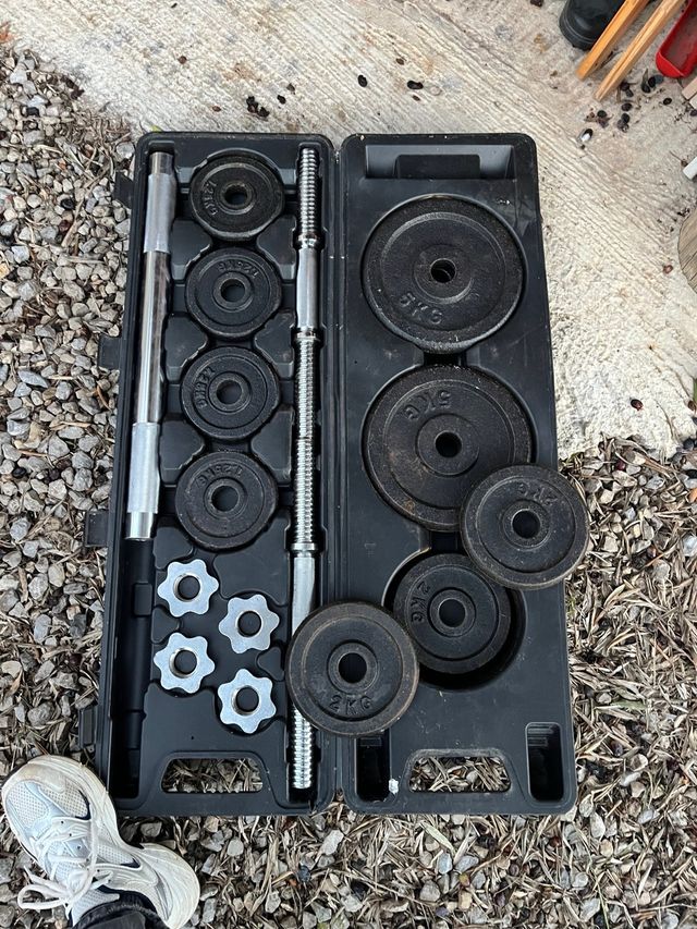 Detalles del productoSet de mancuernas ajustables con maletín para guardarlas.