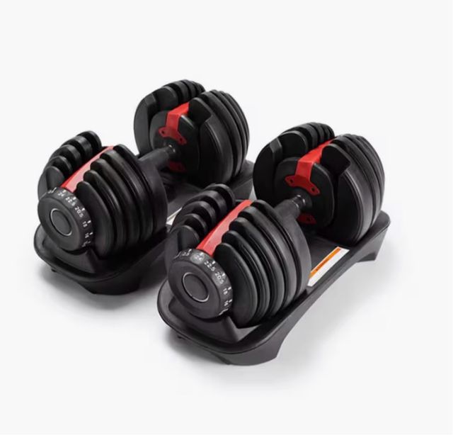 Set de mancuernas ajustables con base. - Diseño moderno en negro y rojo. - Mecanismo de ajuste de peso. - Base para almacenamiento y ajuste.