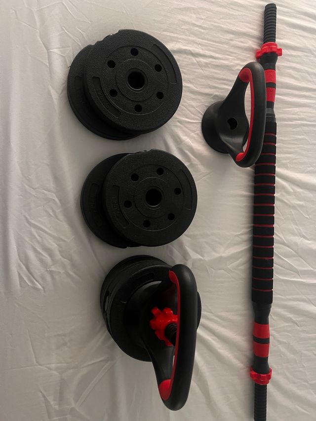 Detalles del productoSet de mancuernas ajustables para entrenar en casa. Incluye varios discos de peso y barras.
