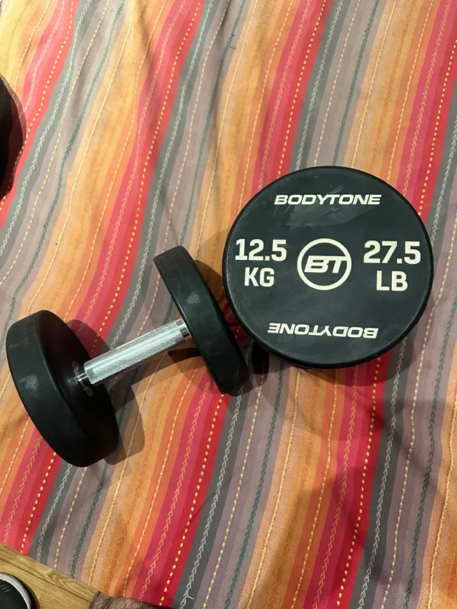Par de mancuernas Bodytone de 12.5 kg cada una. - Peso: 12.5 kg (27.5 lb). - Marca: Bodytone. - Diseño redondo.