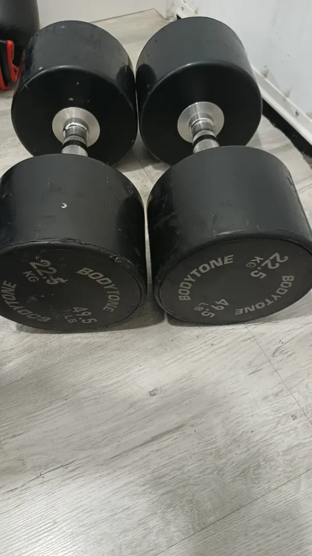 Detalles del productoPar de mancuernas Bodytone de 22.5 kg cada una. Uso profesional de uretano. Precio en tienda nuevas 295€ ver en las fotos o buscar precio por internet