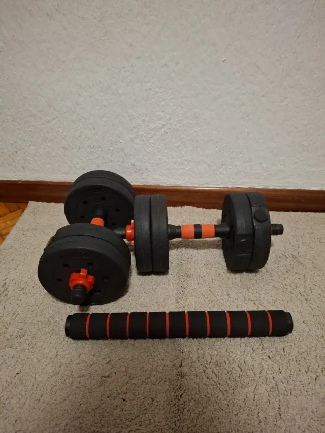 Set de mancuernas ajustables y barra de conexión. - 4 discos de 1 kg y 4 discos de 1,25 kg - Barra con agarre de espuma