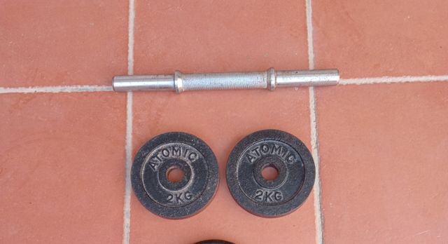 mancuerna con 2discos de peso 2 kilos y una barra de 2k las abrazaderas no las tengo. - Incluye barra de mancuerna. - Dos discos de 2 kg cada uno. Total 6kilos la pesa