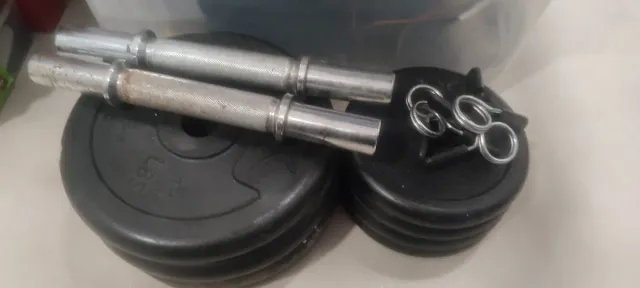 Detalles del productoSet de mancuernas con discos y cierres para ejercicios con protección de caucho como nuevas.