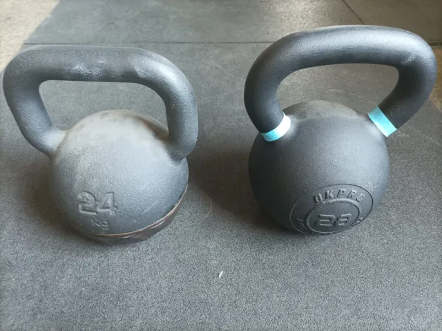 Detalles del productoPar de mancuernas de CrossFit, una de 24 kg y otra de 28 kg. Ideales para entrenamientos de fuerza y acondicionamiento.
