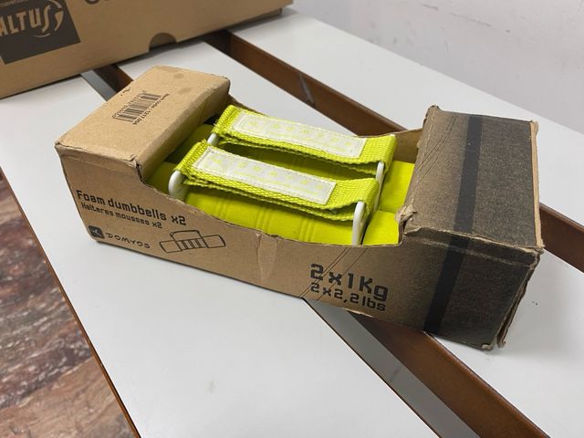 Par de mancuernas de espuma de 1kg cada una. Tienen muy poco uso, en su caja todavia. - Color amarillo brillante. - Asas de tela con velcro. - Marca: Domyos