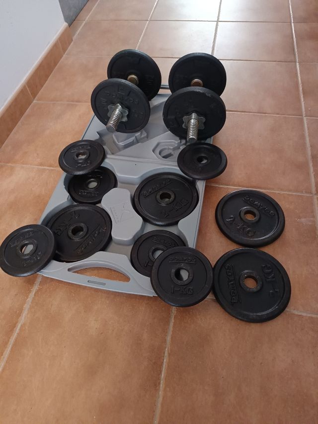 Detalles del productoJuego de mancuernas Domyos en buen estado. Ideales para entrenamiento en casa. Cada mancuerna es de 14kg contando con la barra