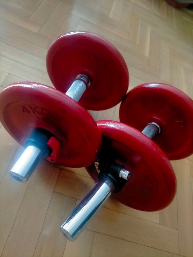 - Peso: 10kg cada una en total,dos discos de 4kg y la barra de 2kg.