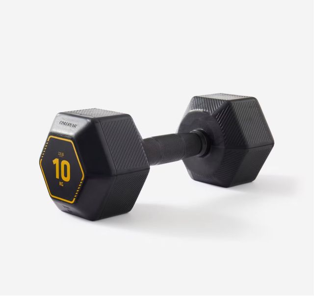 Detalles del productoMancuernas hexagonales Decathlon de 10 kg cada una, recubiertas de caucho para un mejor agarre y protección.