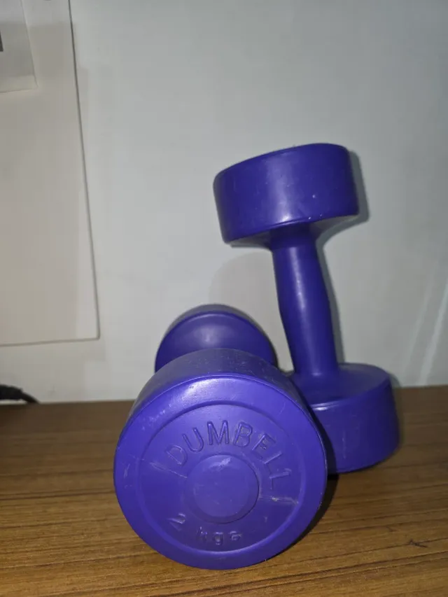 Par de mancuernas moradas de 2kg cada una. Ideales para entrenamientos en casa. - Color morado. - Peso: 2 kg por mancuerna. - Material: Plástico con relleno.