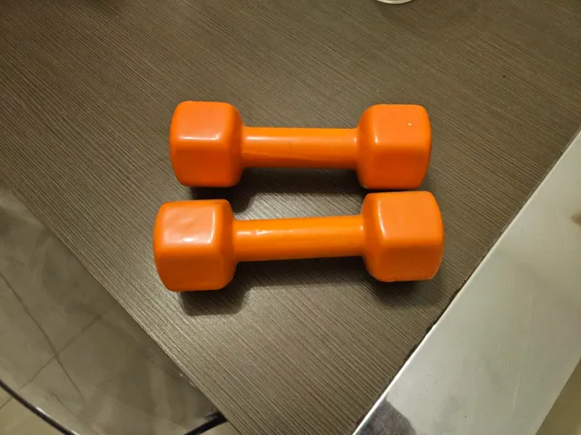 Par de mancuernas de color naranja, ideales para ejercicios en casa. - Diseño ergonómico para un agarre cómodo. - Cubierta exterior para proteger el suelo.