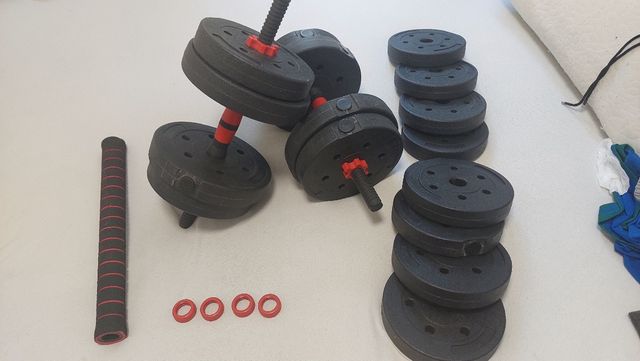 Detalles del productoJuego de mancuernas con pesas de plástico. Ideales para hacer ejercicio en casa.