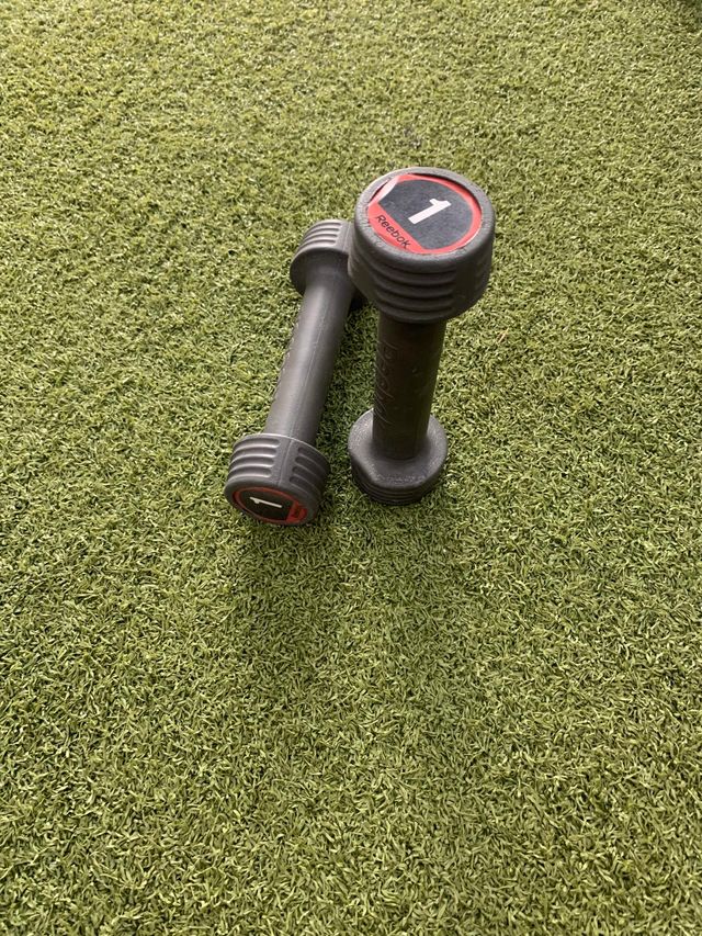 Detalles del producto1,5 €/kg .Par de mancuernas Reebok de 1kg y 2kg cada una, perfectas para entrenamientos en casa.