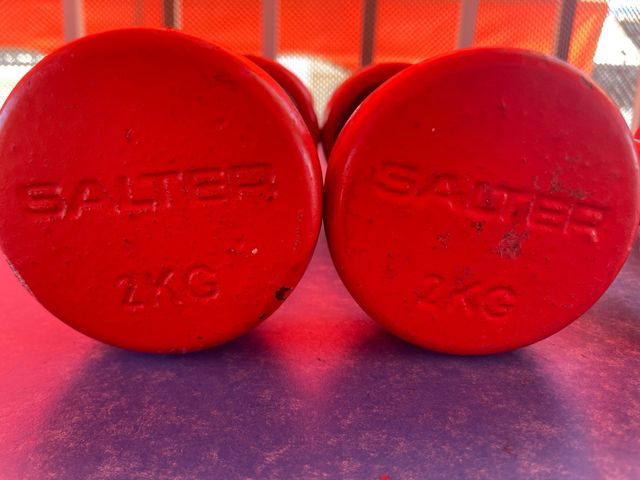 Detalles del productoPar de mancuernas Salter, una de 1kg,otra de 2kg y par de mancuernas de 0,5kg.Están en buen estado, aunque muestran señales normales de uso.