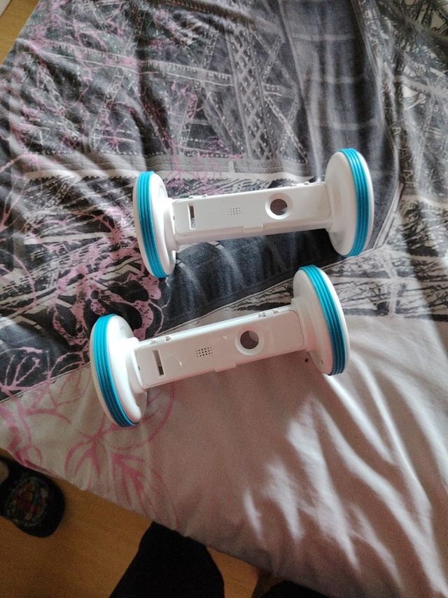 Se venden dos mancuernas para Wii Fit Plus. Están en buen estado y son ideales para hacer ejercicio. - Son de color blanco y azul. - Incluyen dos piezas.