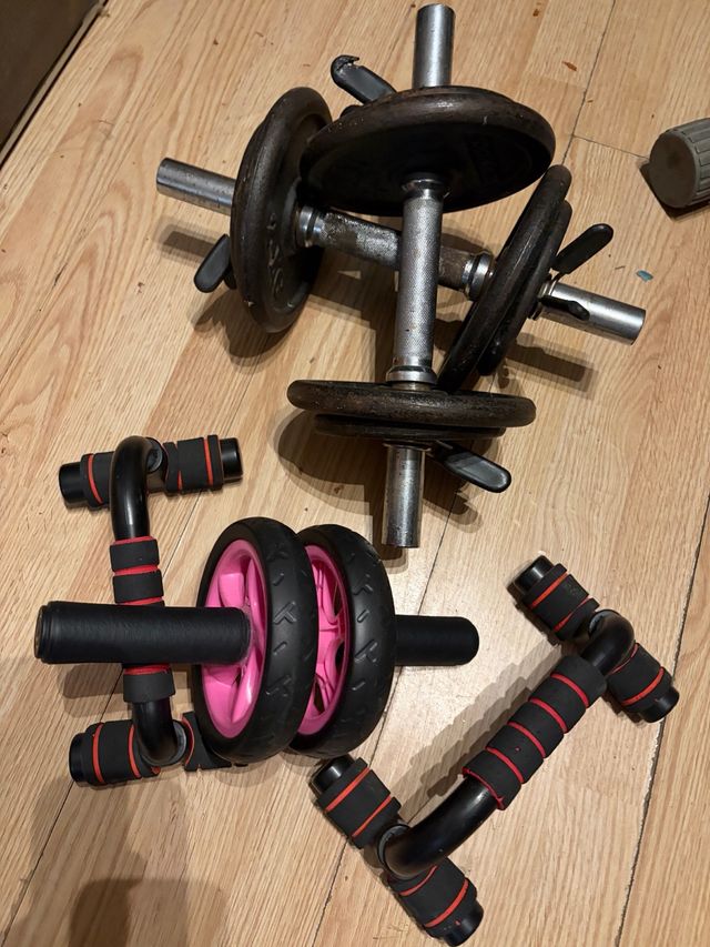 Set de mancuernas y accesorios para entrenamiento en casa. - Mancuernas con discos. - Rueda abdominal. - Empuñaduras para flexiones.