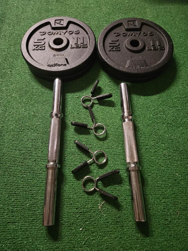 Set de mancuernas y discos de peso. - Dos mancuernas con agarre texturizado. - Cuatro discos de 5 kg cada uno.