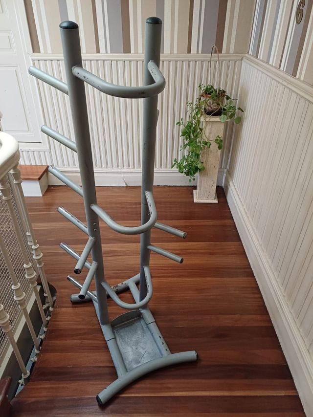 Mancuernero de metal para colocar mancuernas de diferentes tamaños y pesos, y barras.