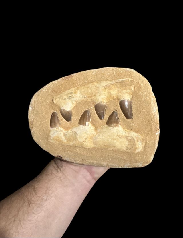 Fósil de mandíbula de Mosasaurus con dientes. 16x12 cm - Dientes de Mosasaurus incrustados en matriz. - Pieza de colección Azul - CC-7