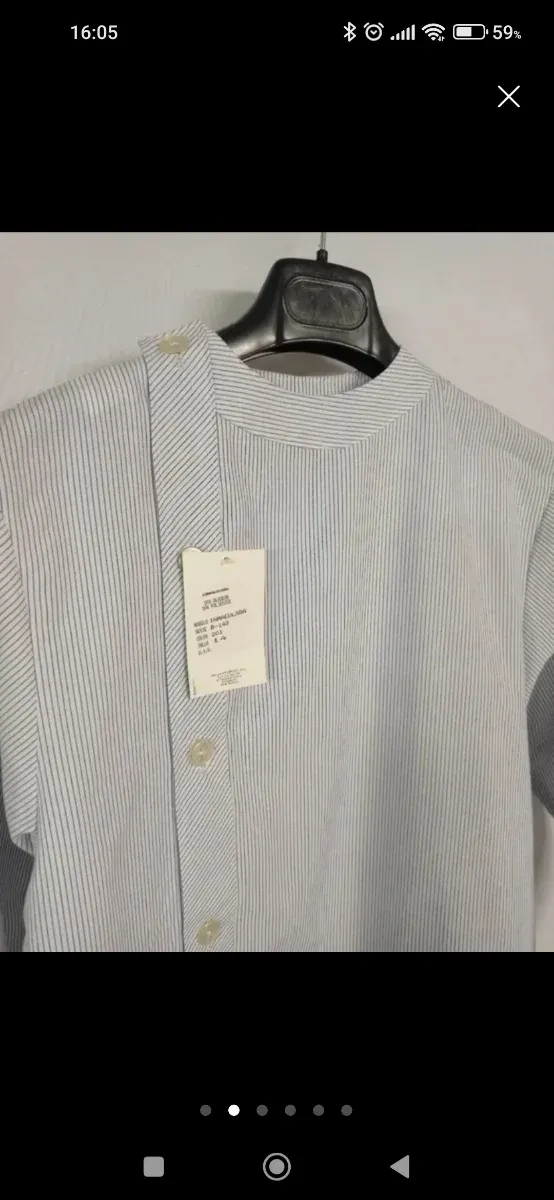 Tejido de rayas. Botones en la parte delantera y con un bolsillo. Cinturón en la espalda.