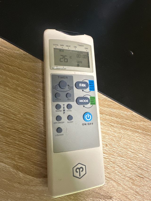 Mando a distancia para aire acondicionado. - Funciones: Cool, Dry, Heat, Fan, Mode, Timer, Sleep, Air Sweep, Louver. - Pantalla LCD. - Botón ON/OFF.
