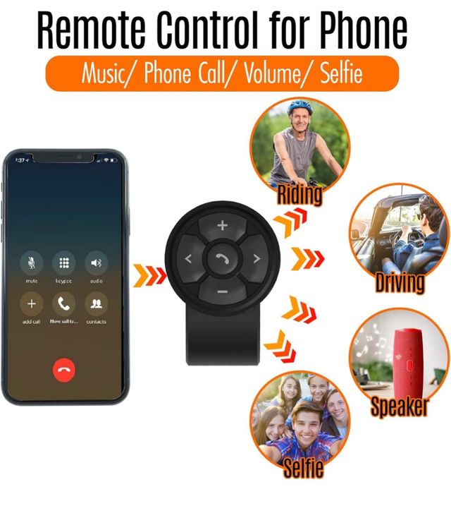 Detalles del productoControl remoto Bluetooth qxs 001 para tu teléfono, ideal para usar en moto , bici, patinete o coche. Permite controlar música, llamadas, volumen y tomar selfies.