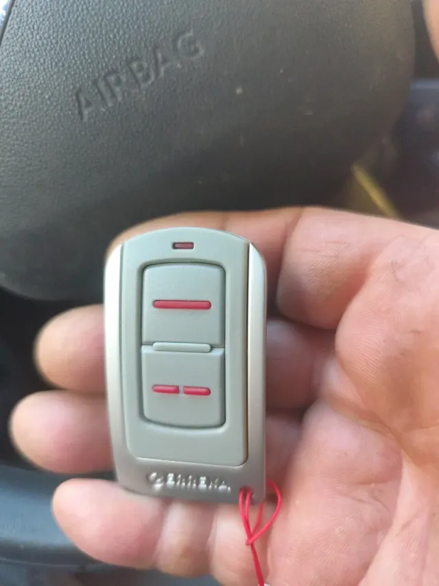 Mando a distancia para garaje con dos botones y un indicador LED. - Diseño plateado y gris. - Llavero rojo incluido.