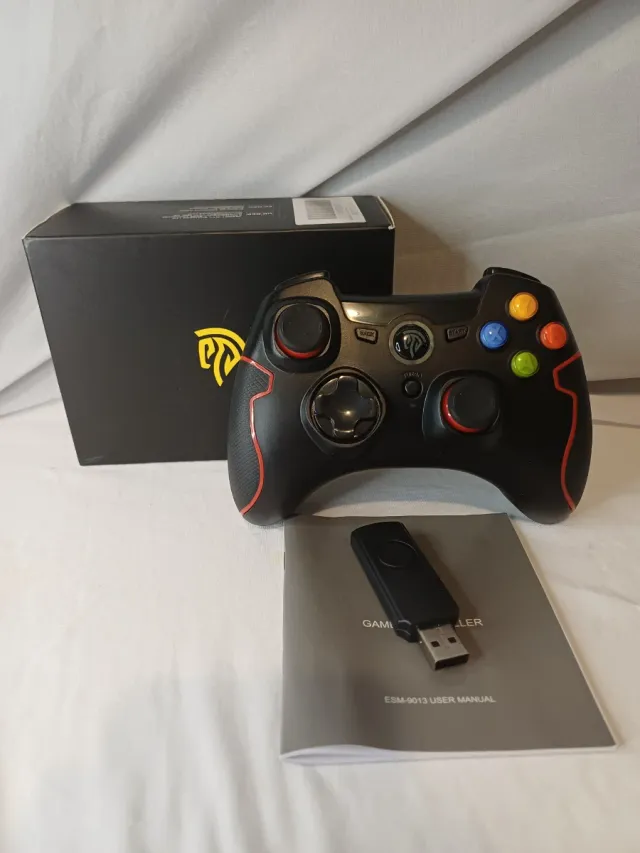 Detalles del productoMando inalámbrico para juegos con diseño ergonómico y acabados en negro con detalles rojos.